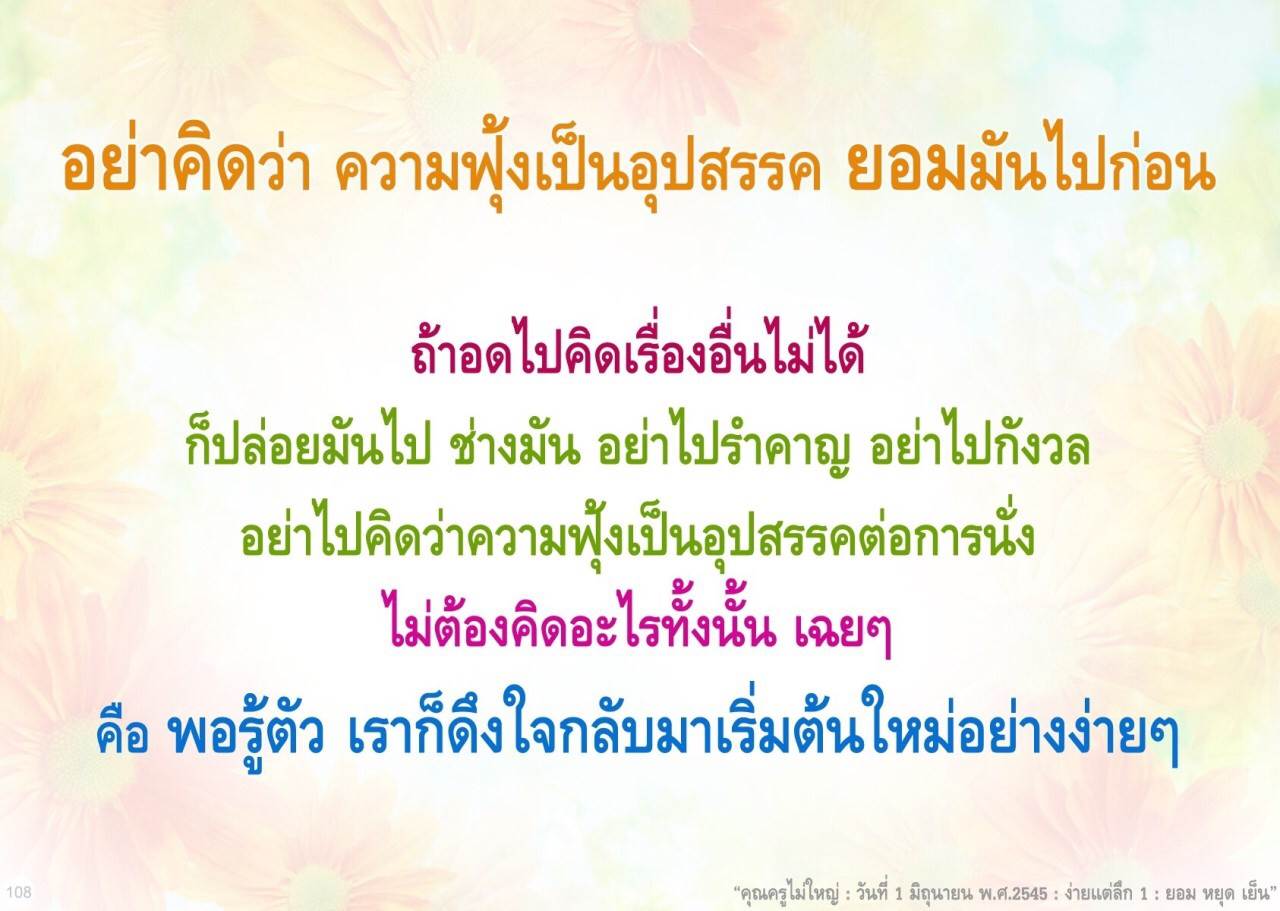 lotusใจหยุดนิ่ง ได้ผลบุญอันเลิศ ••• ใครเอาใจนี่มาหยุดนิ่ง อยู่ที่ศูนย์กลางกายได้มาก จะให้ทาน ทานนั้นก็เลิศ จะทอดผ้าป่า ผ้าป่านั้นก็เลิศ จะรักษาศีล ถ้าเอาใจมาหยุดนิ่งอยู่ที่ตรงนี้ ศีลนั้นก็ศีลเลิศ เรียกว่าอธิศีล ถ้าจะเจริญภาวนา จะทำทางมรรคผลนิพพานให้เกิดขึ้น ••• ใจหยุดนิ่งถูกส่วน ปุญญาภิสันธาน ทางมาแห่งบุญ ที่มีอาการไหลคล้ายกับกระแสน้ำ ก็เลิศ ก็จะเกิดขึ้นที่ศูนย์กลางกาย นี่หลักของการบำเพ็ญบุญมีอยู่อย่างนี้ ••• ต้องทำใจของเรานี่ให้หยุด ให้นิ่ง ให้ถูกส่วนอยู่ที่ศูนย์กลางกายของเรา ถ้าถูกส่วนตรงนี้แล้ว ศูนย์กลางจะเป็นภาชนะอันยิ่งใหญ่ ที่สะอาด ที่บริสุทธิ์ ผ่องใส ••• จะรองรับบุญกุศลเกิดขึ้นมาเป็นอสงไขยอัปมาณัง คือจะนับจะประมาณมิได้ เหมือนกับท้องทะเลมหาสมุทรที่กว้างใหญ่ไพศาลน่ะ เป็นที่รองรับ จากน้ำบนแผ่นดินที่ไหลมาจากห้วยหนอง คลองบึง ทั้งหลาย นี่ขอให้พวกเราให้เข้าใจกันอย่างนี้นะ sunflowerทบทวนโอวาทคุณครูไม่ใหญ่