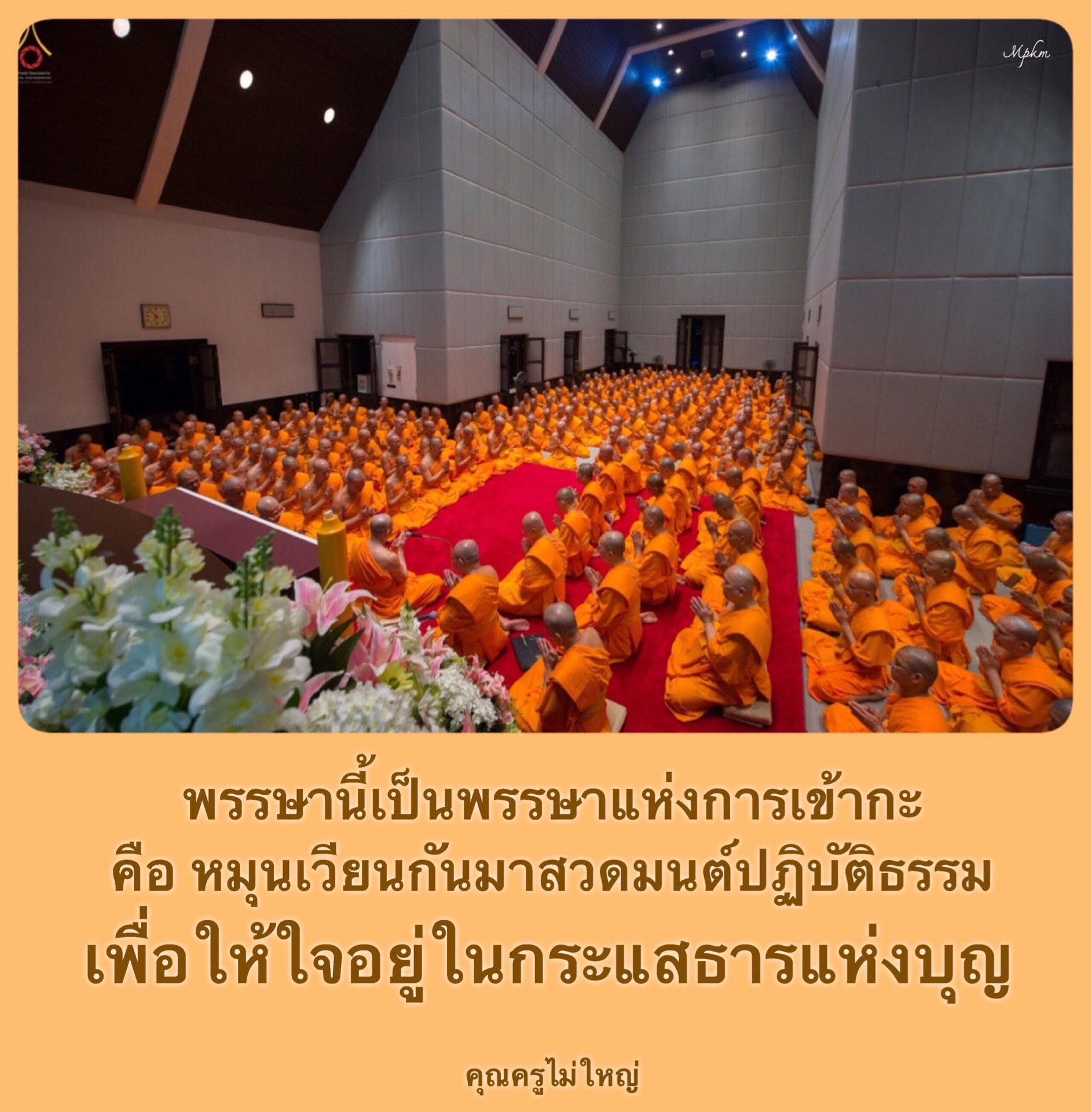 lotus พรรษาแห่งการปฏิบัติบูชา ••• พรรษานี้เป็นพรรษาแห่งการเข้ากะ คือหมุนเวียนกันมาสวดมนต์ ปฏิบัติธรรม เพื่อให้ใจอยู่ในกระแสธารแห่งบุญ ••• การบูชาเราต้องบูชาทุกวัน เมื่อเราบูชาด้วยอามิสบูชาแล้ว ก็ต้องมาปฏิบัติบูชาด้วย เพื่อให้ได้ทั้ง ๒ บูชากันในพรรษานี้ ••• ถ้าลูกทุกคนทำได้ จะถือเป็นสิ่งอัศจรรย์ เพราะลูกทุกคนก็จะได้ทั้งบุญที่เป็นบ่อเกิดแห่งโลกียทรัพย์ และอริยทรัพย์ติดตัวเราไป sunflower ทบทวนโอวาทคุณครูไม่ใหญ่