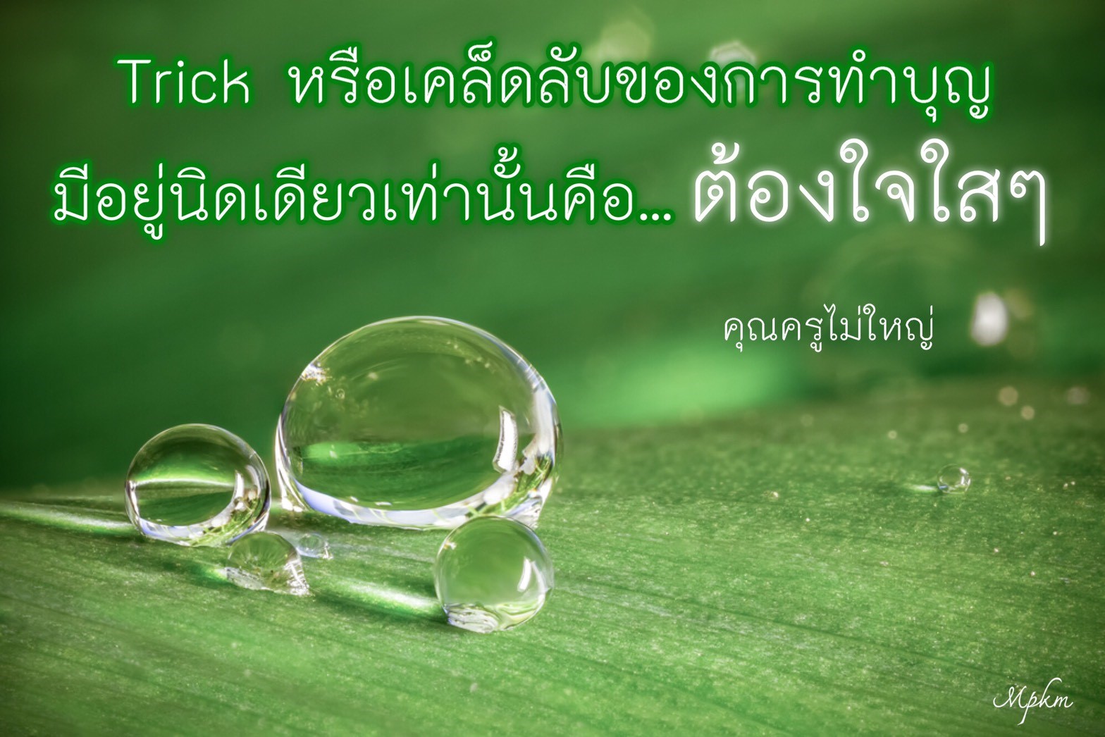 lotus ทำบุญให้ถูกหลักวิชชา ••• หลวงพ่อเสียดายบุญนะ ถ้าหากว่ามันหกๆ หล่นๆ อยากจะพยายามประคับประคองให้ลูกๆ ทุกคนทำบุญเป็น ให้ได้บุญกันเต็มเม็ดเต็มหน่วย ต้องฉลาดในการสร้างบุญ ในการหาบุญ ในการรักษาบุญ ในการใช้บุญ ••• ต้องทำให้ถูกหลักวิชชา ที่ผ่านมาก็แล้วๆ ไป แต่ที่จะมาถึงในอนาคต ต้องทำให้เป็น ถึงแม้ต้นคดแต่ปลายมันต้องตรงๆ บุญต้องเต็มเม็ดเต็มหน่วย ••• เรื่องนี้ยายจะสั่งสอนอบรมนัก เกี่ยวกับเรื่องการหาบุญ การใช้บุญต้องประณีต ต้องละเอียด เพราะฉะนั้นท่านจะทำทุกสิ่งทุกอย่างด้วยความประณีต แล้วอธิษฐานจิตล้อมคอกรัดกุม ไม่มีช่องว่างช่องโหว่ ที่พญามารจะได้ช่องเอาสิ่งไม่ดีมา สอดละเอียด ให้ไปเป็นวิบัติได้เลย sunflower ทบทวนโอวาทคุณครูไม่ใหญ่ วันที่ 10 กันยายน พ.ศ. 2545