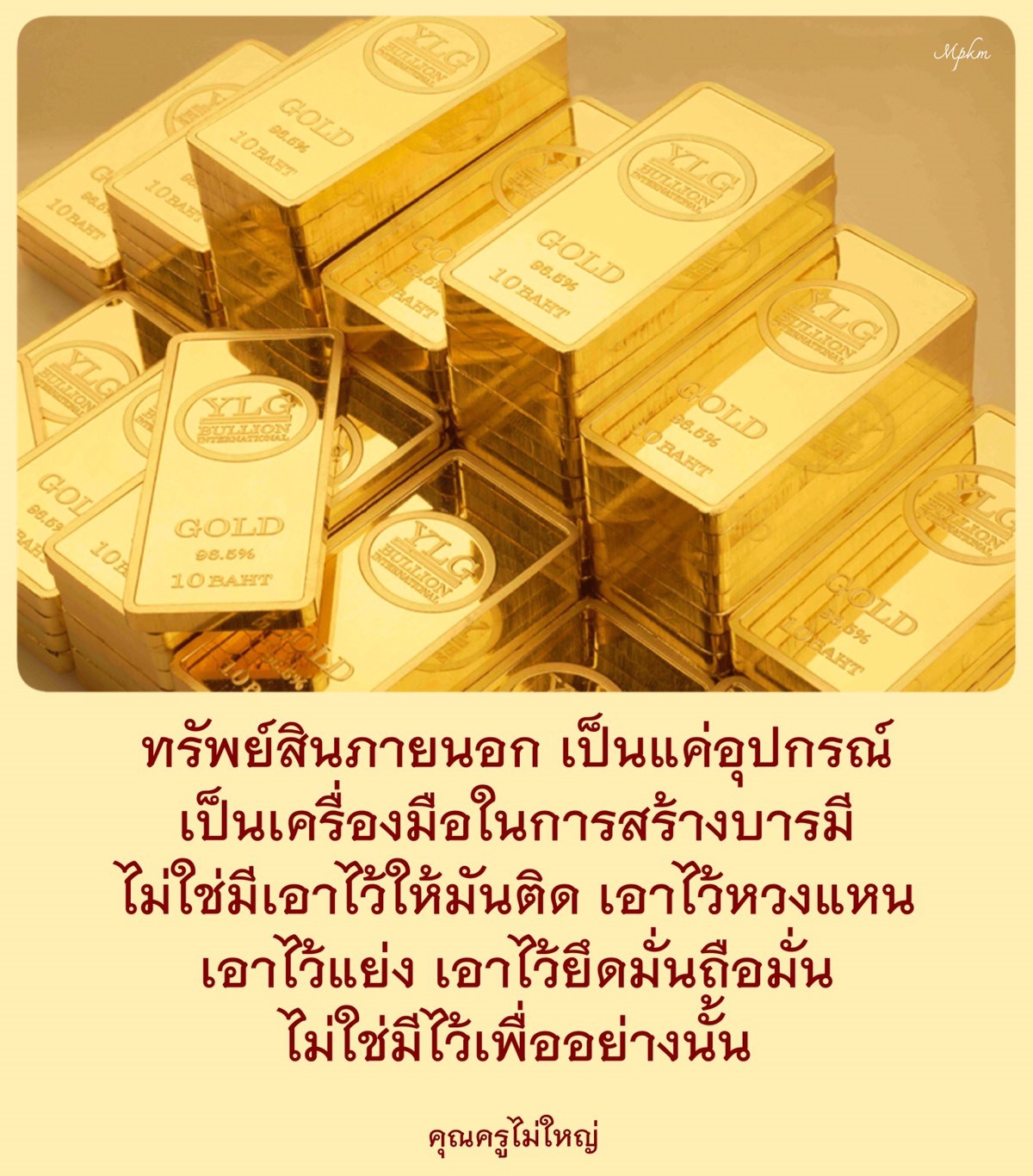 lotus ทรัพย์สินเป็นอุปกรณ์เครื่องมือในการสร้างบารมีเท่านั้น ••• ทรัพย์สินภายนอกเป็นแค่อุปกรณ์ เป็นเครื่องมือในการสร้างบารมี ไม่ใช่มีเอาไว้ให้มันติด เอาไว้หวงแหน เอาไว้แย่ง เอาไว้ยึดมั่นถือมั่น ไม่ใช่มีไว้เพื่ออย่างนั้น มีไว้แค่เป็นสะพาน เป็นอุปกรณ์ เป็นเครื่องมือสำหรับ ส่งต่อให้เข้าถึงกายธรรมอรหัต ••• เหมือนรถหลายๆ ผัด ที่ส่งต่อกันไป ให้ถึงที่หมายปลายทาง โดยปลอดภัยเท่านั้นแหละ ไม่ใช่มีเอาไว้ยึดมั่นถือมั่น ถ้าเรายังไม่ถึง เพราะมัวไปติดยึดกันอยู่อย่างนั้นแหละ ก็ต้องเวียนว่ายตายเกิดอยู่ร่ำไป ••• มันมีเครื่องที่ทำให้ดึงดูด ติดอยู่ในภพสาม อยู่ในกลางภพสามเลย แล้วก็ประกอบเหตุเอาไว้ บุญบาปประกอบกันอยู่ในนั้น ส่งไปเกิดตามภพภูมิต่างๆ ตามกำลังแห่งกรรมที่กระทำเอาไว้ ••• แต่ถ้าเข้าถึงกายธรรมอรหัตอย่างนี้หลุดไปเลย หลุดจากภพสาม หลุดหมด มีนิพพานเป็นที่ไป มีความสุขรองรับกันอยู่ ซึ่งผู้ที่เข้าถึงก็จะรู้ได้ด้วยตัวของตัวเอง sunflower ทบทวนโอวาทคุณครูไม่ใหญ่